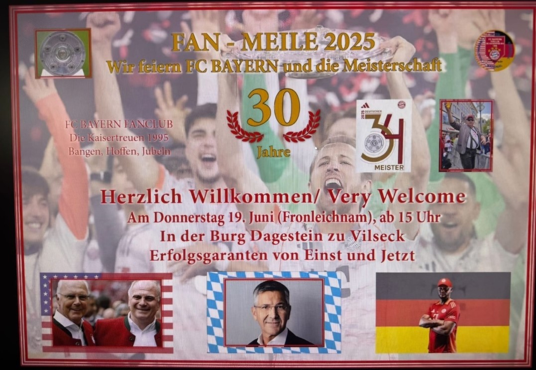 Vilseck: Am 19.06.2025 findet wieder die Fanmeile des FC Bayern Fanclubs Die Kaisertreuen 1995 im Kirwastodel der Burg Dagestein in Vilseck statt.